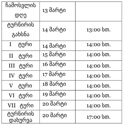 დროის კონტროლი: თითოეულ მონაწილეს მიეცემა 60 წუთი პარტიის ბოლომდე,