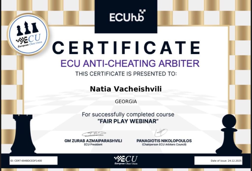 სიახლეებინათია ვაჩეიშვილი სამართლიანი თამაშის წესების დაცვის სერტიფიცირებული მსაჯი გახდა! თებერვალი 23, 2026თებერვალი 23, 2026 - by acf ბათუმელმა მწვრთნელმა ნათია ვაჩეიშვილმა წარმატებით გაიარა “Fair Play Webinar” და ევროპის საჭადრაკო კავშირისგან მიიღო სამართლიანი თამაშის წესების დაცვის მსაჯის სერტიფიკატი.