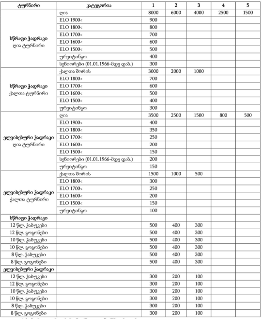 სწრაფ ჭადრაკში: ღია და ქალთა შორის ტურნირებში – 70 ლარი. ასაკობრივ ტურნირებში – 50 ლარი.