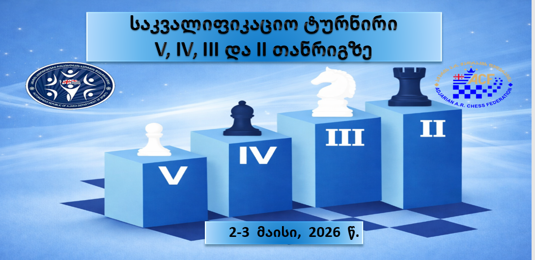 აჭარის ჭადრაკის ფედერაციის ორგანიზებით და აჭარის სპორტის დეპარტამენტის ფინანსური მხარდაჭერით, 2-3 მაისს, მუხრან ვახტანგაძის სახელობის ბათუმის სპორტის სასახლეში V, IV, III და II თანრიგზე საკვალიფიკაციო ტურნირი გაიმართება.