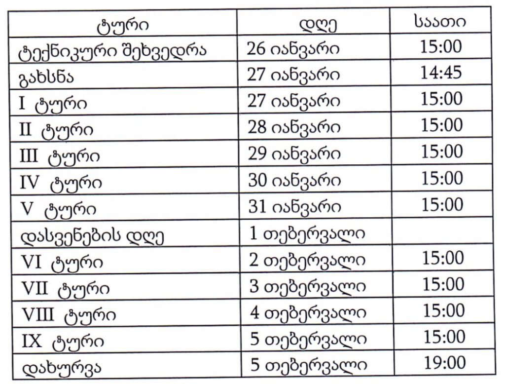 ტურნირები წრიული სისტემით 10 მონაწილეს შორის ჩატარდება. დროის კონტროლი: 90 წუთი 40 სვლაზე, შემდეგ 30 წუთი პარტიის ბოლომდე, პირველი სვლიდან 30 წამის დამატებით თითიეულ სვლაზე.