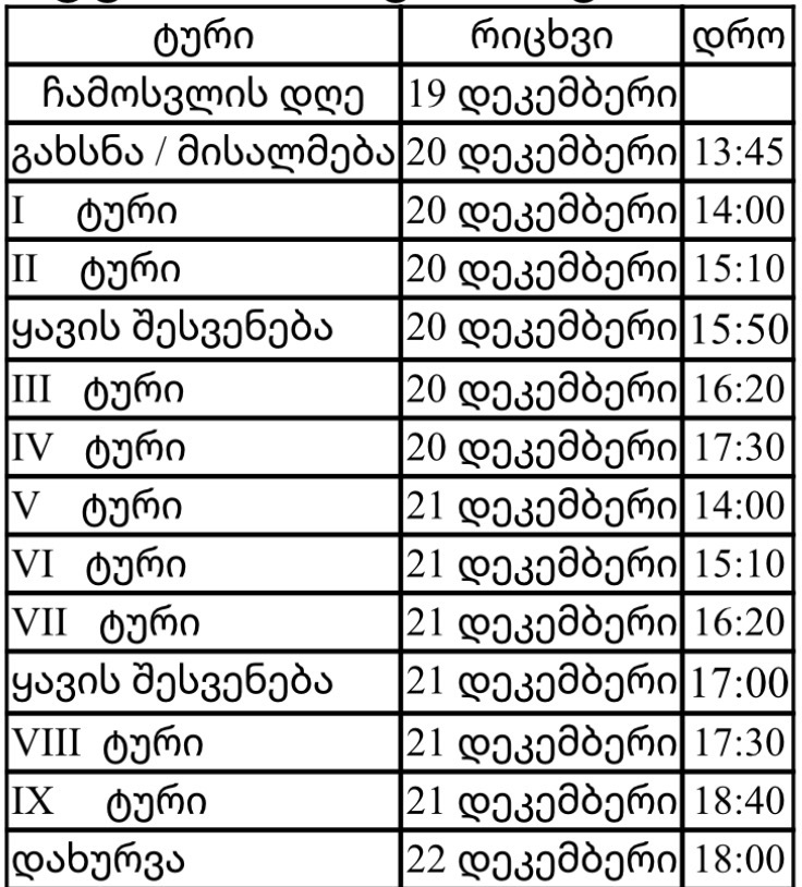 - 2025 წლის 14, 16, 18 და 20 წლამდე საქართველოს ჩემპიონებს სტანდარტულ ჭადრაკში.