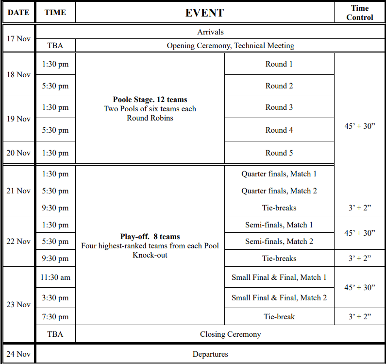 თითოეული ჯგუფი ითამაშებს წრიული სისტემით ხუთ ტურად. დროის კონტროლი მთელი პარტიის განმავლობაში 45 წუთი, თითოეულ სვლაზე 30 წამის დამატებით.