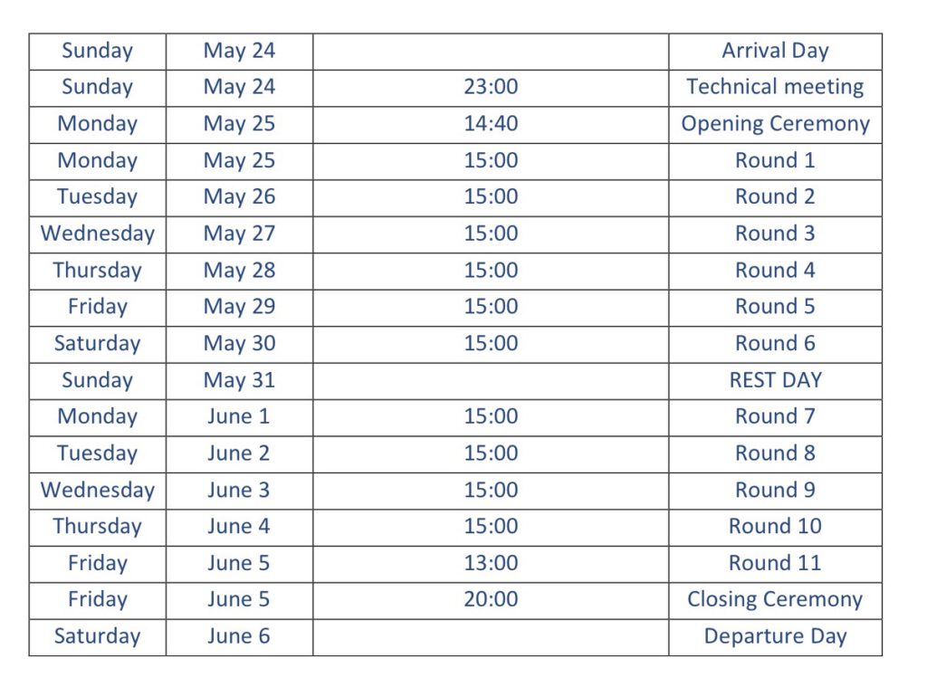 ღონისძიება ტარდება 11 ტურად, შვეიცარული სისტემით. დროის კონტროლი: 90 წუთი 40 სვლაზე, შემდეგ 30 წუთი პარტის ბოლომდე, ყოველ სვლაზე 30 წამის დამტებით.